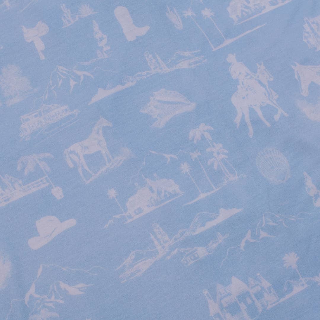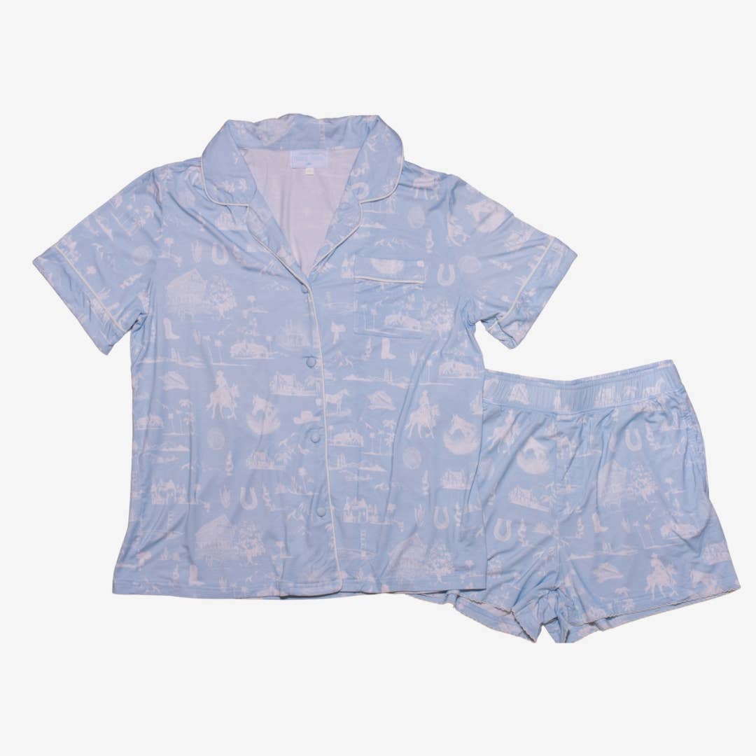 Sold as a set, this classic button down collared t-shirt and elastic shorts (with pockets!!). Please note there is 5% spandex so there is some stretch to these! Materials & Details: - Breathable and ultra soft Bamboo Viscose 95% and 5% spandex for stretch and comfort - Signature western coastal cowboy vintage blue toile print - Shorts have an elastic, comfortable waistband with pockets and a cute scalloped edge - Shirt has real fabric buttons with front pocket and white pipe detailing Care Instructions: - Cold machine was on delicate with like colors - Line dry in the shade