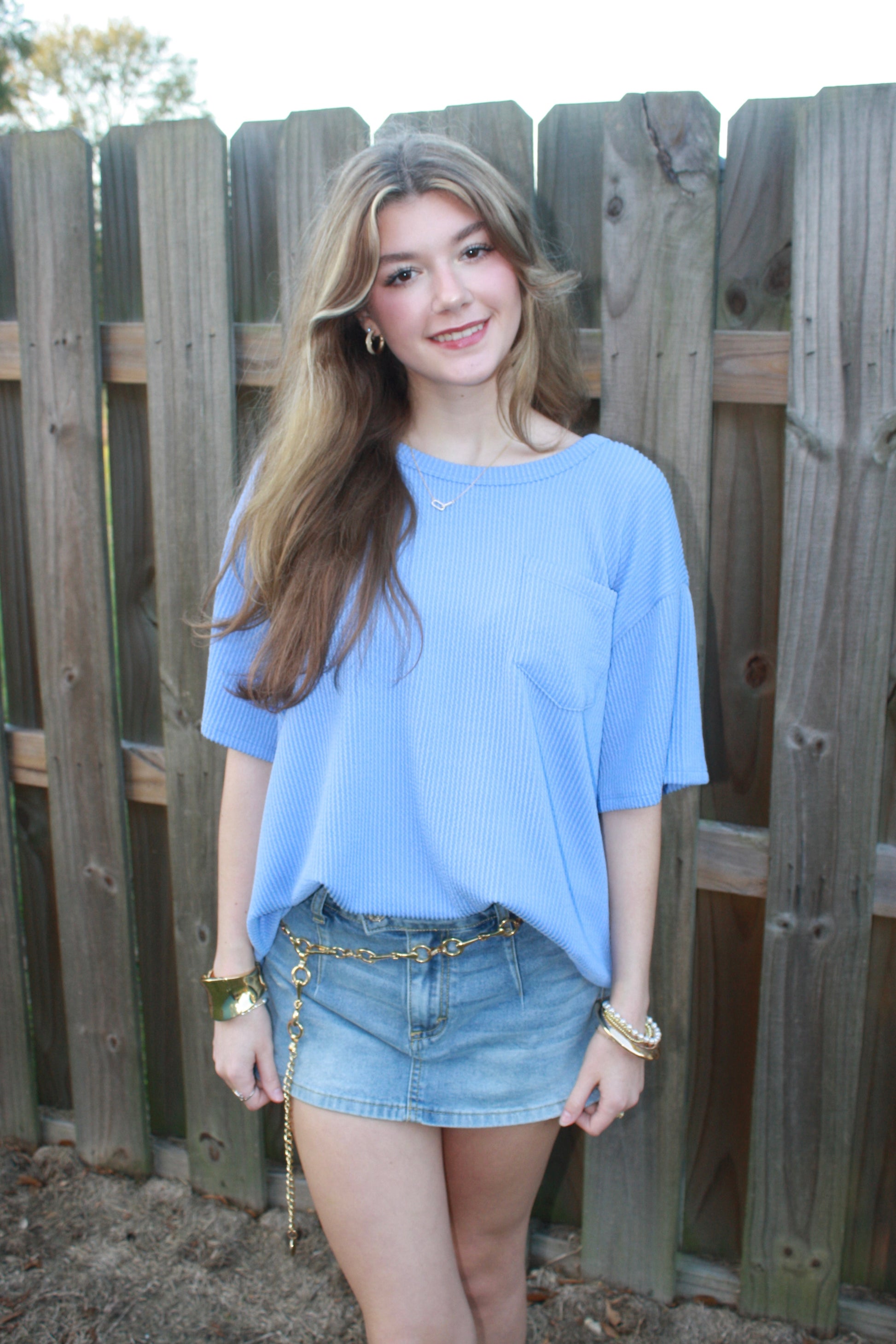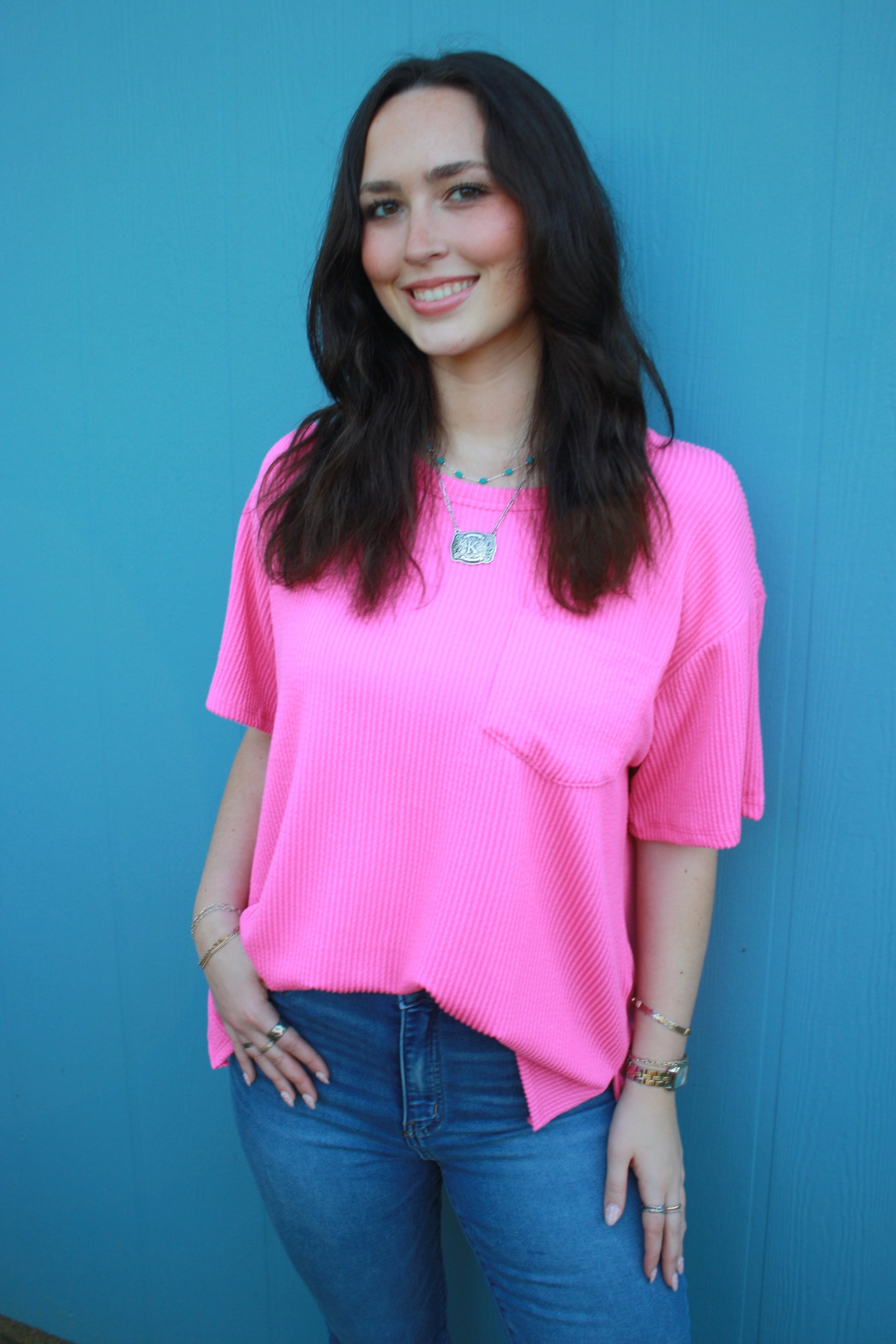 Embrace effortless style with this half-sleeve oversized top, designed with a relaxed fit for all day comfort. The classic round neckline offers a simple, flattering silhouette, and the front pocket adds a functional and stylish detail. Stretchy, knit.