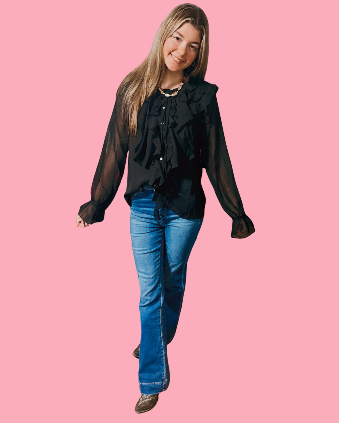 Sheer chiffon blouse with cascading ruffle trim and front tie detail.
