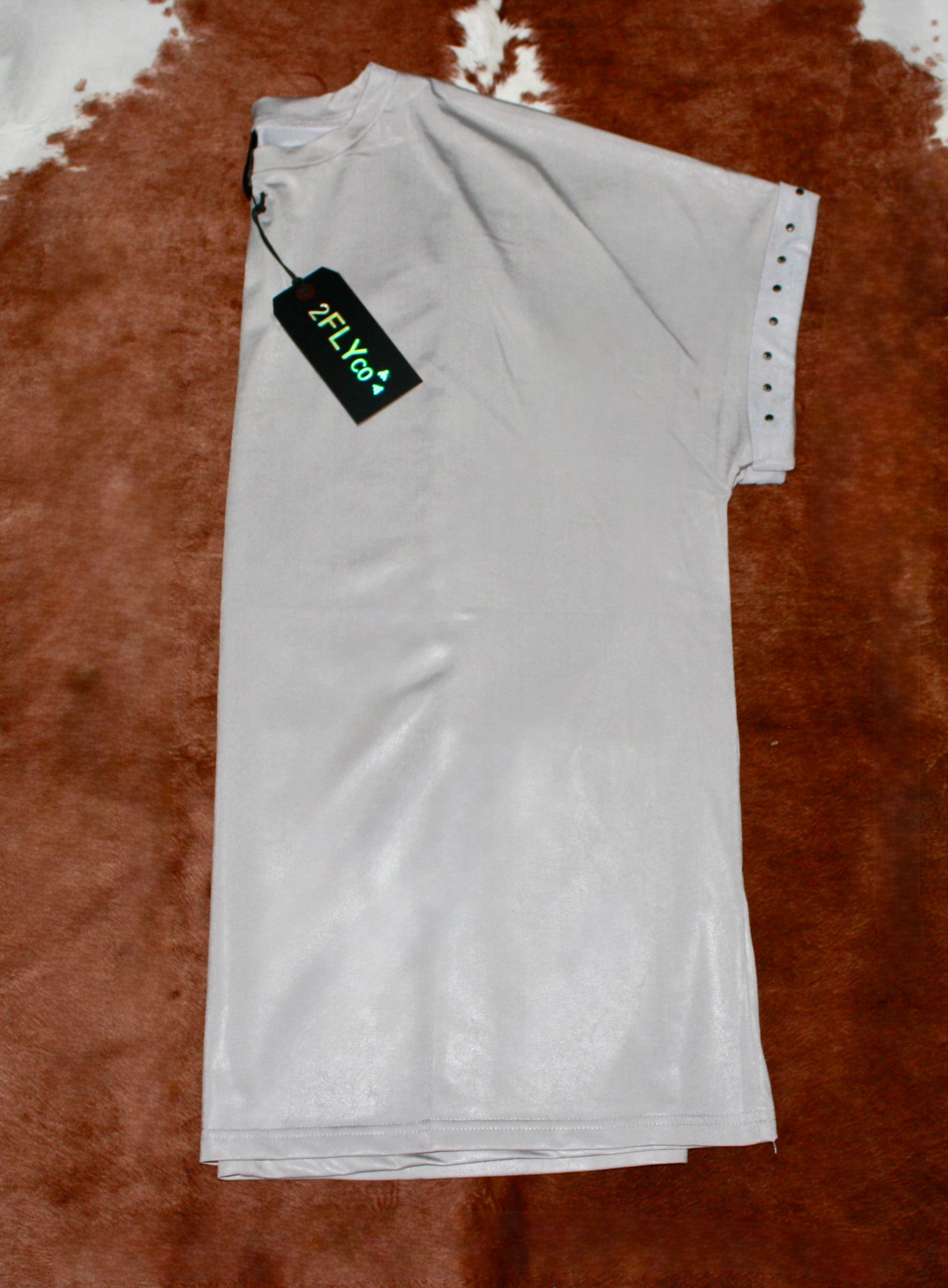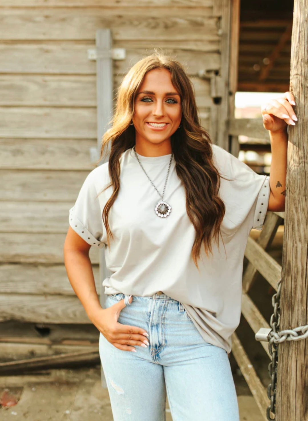 Oversized Cuff Tee with Studded Detailing Around the Sleeves in Smoke Show (light gray).